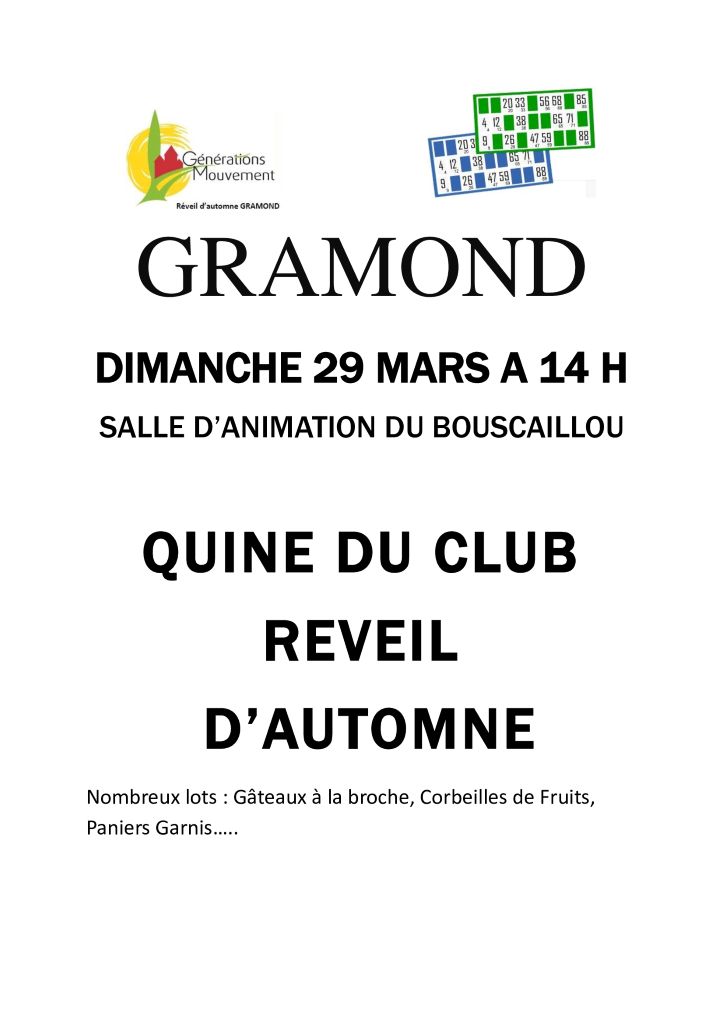 Gramond « Quine » Le 29 mars à 14h Publication publiée :27 mars 2026 Commentaires de la publication :0 commentaire Imprimer Vous devriez également aimer Flavin « Belote » le 06 février à 20h30 1 février 2026 Almont la junies « Quine » le 01 février à 14 29 janvier 2026 St Julien de Piganiol « Concours de Belote » le 13 février à 20h30 8 février 2026 Laisser un commentaire Annuler la réponseCommentEnter your name or username to comment Enter your email address to comment Saisir l’URL de votre site (facultatif) Enregistrer mon nom, mon e-mail et mon site dans le navigateur pour mon prochain commentaire.