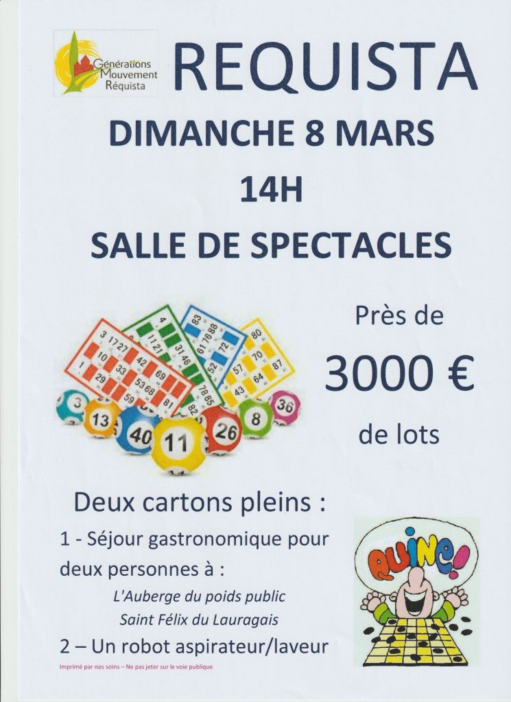 Requista « Quine » le 8 mars à 14h Publication publiée :3 mars 2026 Commentaires de la publication :0 commentaire Imprimer Vous devriez également aimer Sanvensa » Grand Loto » le 15 février à 14h 8 février 2026 St Laurent « Quine » le 01 février à 14h 29 janvier 2026 Villeneuve « Thé dansant » le 22 février à 14h30 19 février 2026 Laisser un commentaire Annuler la réponseCommentEnter your name or username to comment Enter your email address to comment Saisir l’URL de votre site (facultatif) Enregistrer mon nom, mon e-mail et mon site dans le navigateur pour mon prochain commentaire.